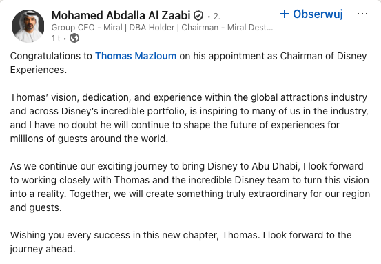 Deklaracja prezesa Miral zbiegła się z istotnymi zmianami kadrowymi w Disneyu. Thomas Mazloum objął funkcję przewodniczącego segmentu Disney Experiences, zastępując Josha D’Amaro. Ten z kolei został nowym dyrektorem generalnym koncernu, przejmując stanowisko po Bobie Igerze.