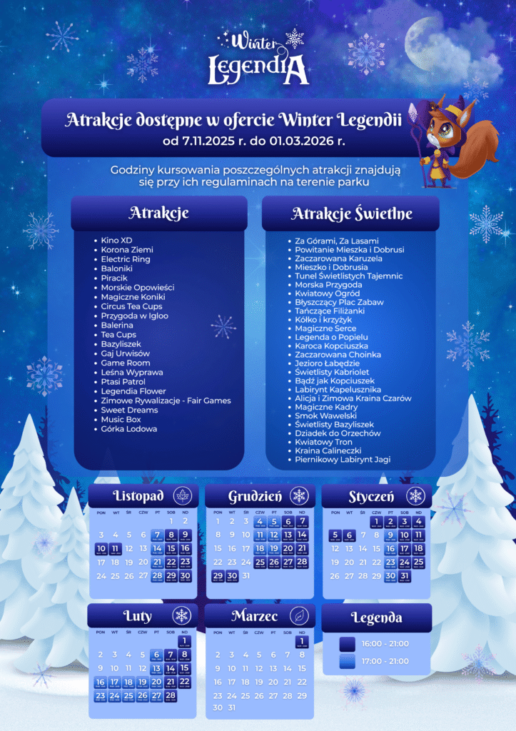 Park zmienia się wtedy w przestrzeń opartą na sezonowej ofercie atrakcji. Goście mogą korzystać m.in. z wybranych karuzel, w tym 40-metrowego diabelskiego młyna Legendia Flower, a także z Jamy Bazyliszka. W tym sezonie uruchomiono również dodatkowe atrakcje: Przygodę w Igloo oraz Snowtubing, czyli zjazdy na oponach.