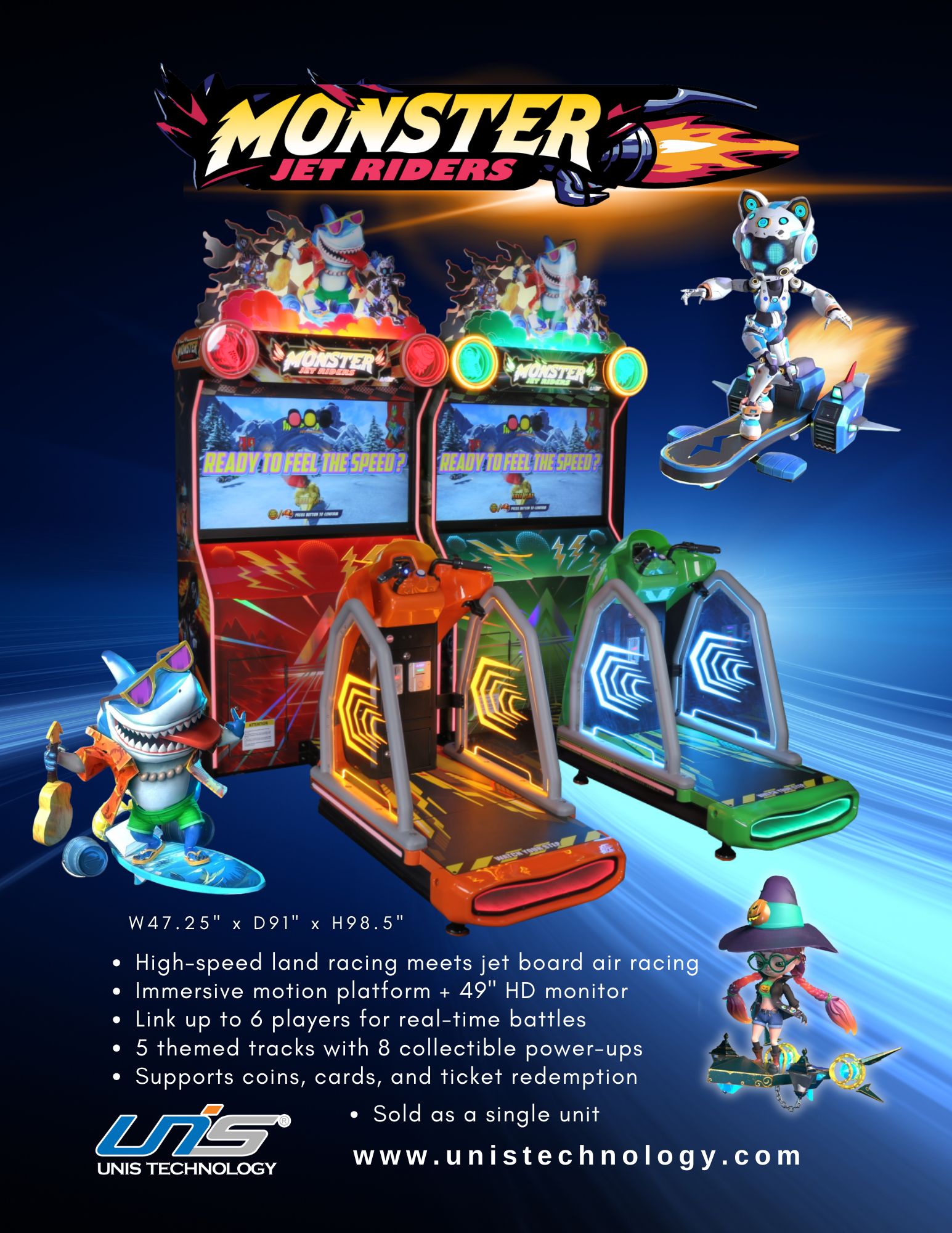 Monster Jet Riders to zupełnie nowa gra zręcznościowa, która łączy w sobie szybkie wyścigi lądowe z wyścigami lotniczymi na odrzutowcach. Wciągająca rozgrywka, emocjonujący tryb wieloosobowy i oszałamiająca grafika HD na 49-calowym ekranie – ta gra została stworzona, by ekscytować graczy i generować wysokie zyski dla operatorów.