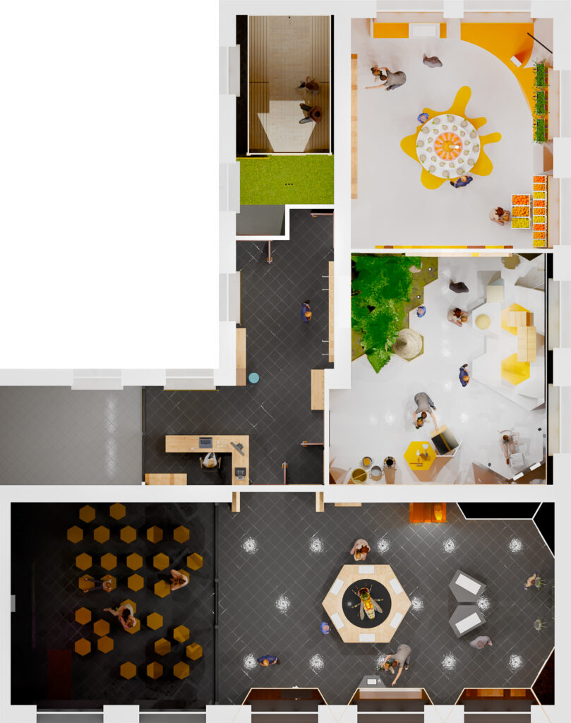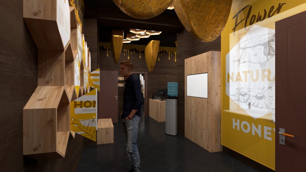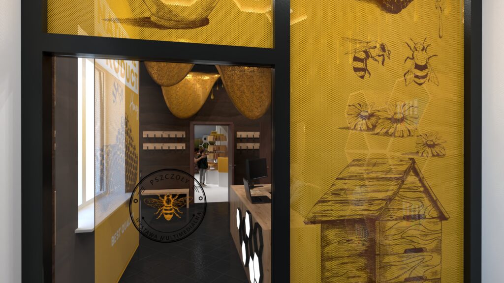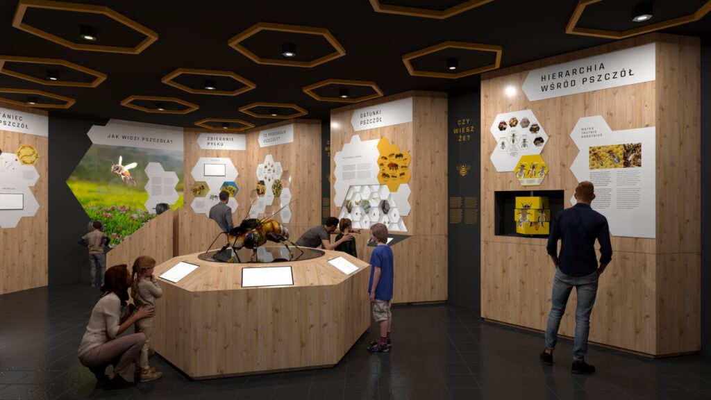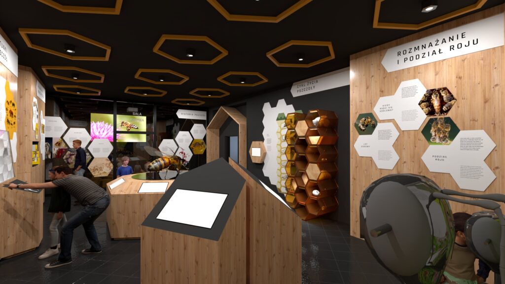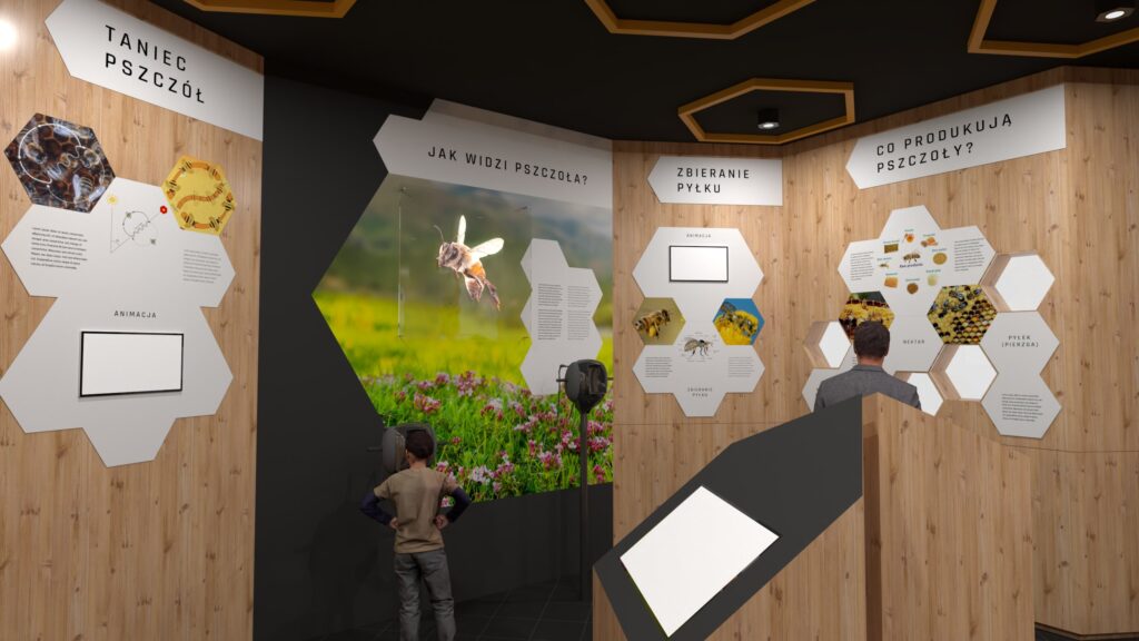 - W hallu wejściowym odwiedzający zapoznają się z ciekawostkami o pszczołach, skorzystają ze stanowisk multimedialnych i gier tematycznych.