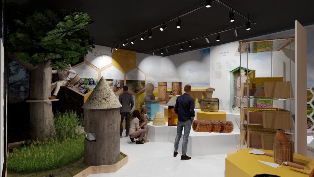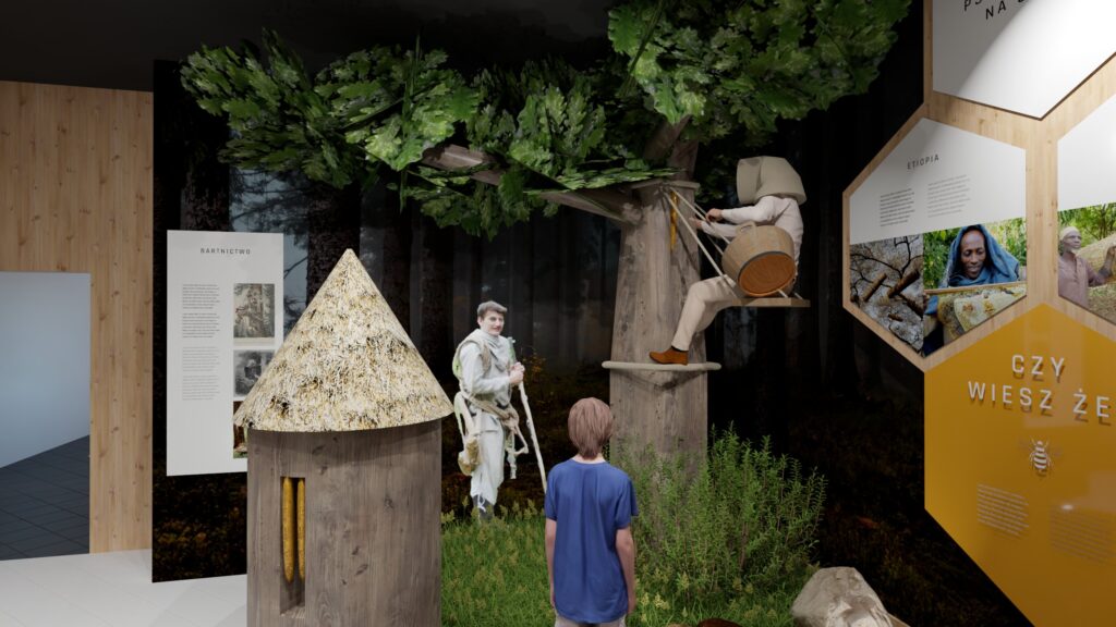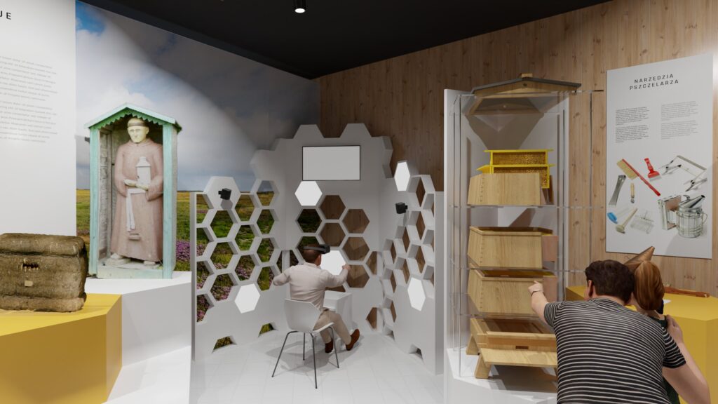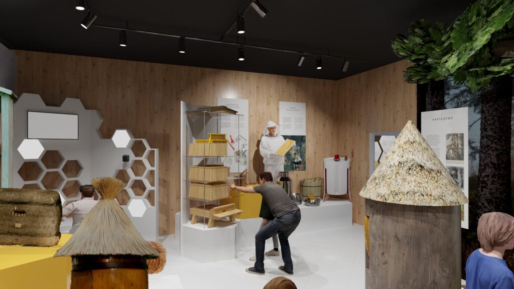 - Następna strefa przybliży historię bartnictwa i współczesne pszczelarstwo, ukazując różnorodność uli oraz umożliwiając interaktywną zabawę w wirtualne prowadzenie pasieki.