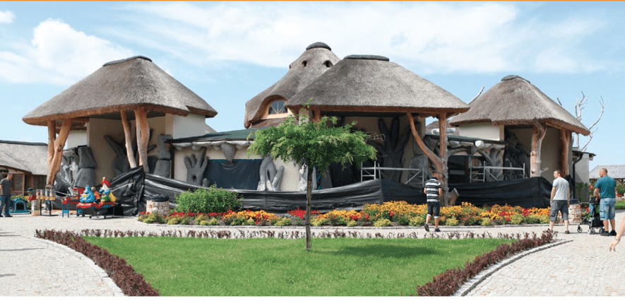 Zaraz po przekroczeniu wejściowego kołowrotka naszym oczom ukazuje się galeria minerałów i skamieniałości, gastronomia oraz budynek, w którym według znajdujących się tam informacji w przyszłości powstanie Pałac Strachów. Następnie docieramy do dużego placu zabaw zaaranżowanego razem z wieżami i różnymi kryjówkami dla dzieci. Oczywiście gastronomia, jak i budynki z pamiątkami są dopasowane do klimatu, jaki panuje w parku. Co chwila napotykamy na ludowych bohaterów, dziwne postacie czy chociażby na Freda Flinstona z rodziną.