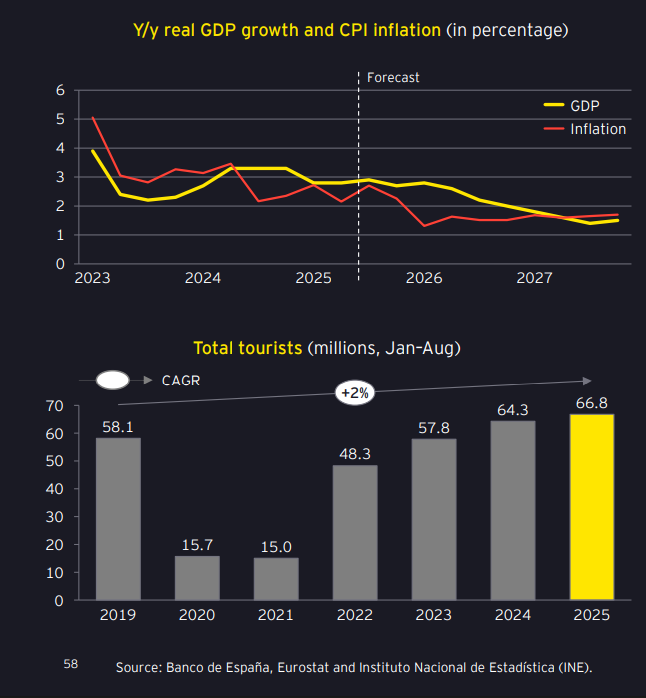 EY przewiduje, że tempo wzrostu PKB w Europie spowolni do 1,1 proc. w 2026 r. głównie ze względu na negatywne skutki zawirowań związanych z cłami. W latach 2027–2028 spodziewane jest jednak przyspieszenie do poziomu odpowiednio 1,6 proc. i 1,8 proc. Najsłabsze tempo rozwoju utrzymają Niemcy (0,2 proc. w 2025 r.). Najwyższe, oprócz Polski, – Hiszpania, która pełnymi garściami skorzysta z turystyki.