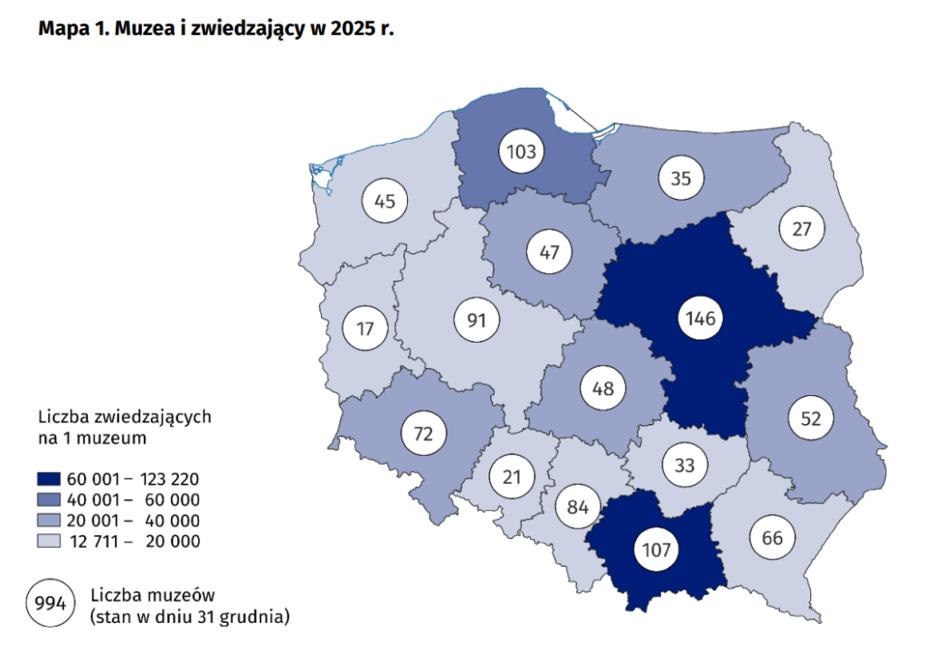 W 2025 r. działalność w Polsce prowadziły 994 muzea, które zwiedziło 46,2 mln osób. To o 4,2 proc. więcej niż rok wcześniej. Muzea w Polsce zaprezentowały 3,0 tys. wystaw stałych oraz zorganizowały 4,6 tys. wystaw czasowych.
