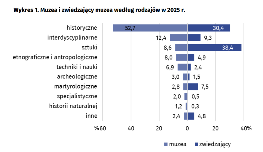 W 2025 r. muzea w Polsce zwiedziło 46,2 mln osób. Oznacza to wzrost o 4,2 proc. w stosunku do 2024 r. Ponad 14,1 mln były to wizyty bezpłatni. Z ogólnej liczby zwiedzających, 7,4 mln osób skorzystało z biletów ulgowych. Zorganizowane grupy młodzieży szkolnej stanowiły 8,2 proc. wszystkich zwiedzających.