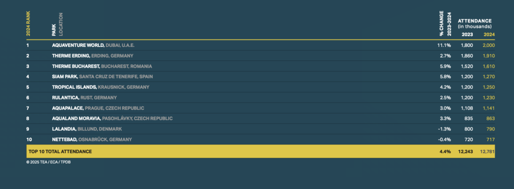 Frekwencja w największych parkach wodnych w regionie EMEA wzrosła w 2024 roku o 4,4 proc. – wynika z danych opracowanych przez The TEA Global Experience Index. Łączna liczba odwiedzin w dziesięciu najpopularniejszych obiektach przekroczyła 12,7 mln (rok wcześniej 12,2 mln). W zestawieniu nie uwzględniono parków wodnych z Polski.