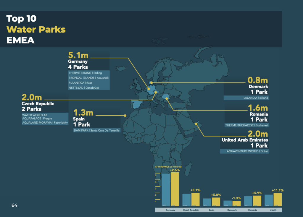 Raport zwraca uwagę na rosnące znaczenie nowoczesnych projektów. W połowie 2024 r. we Francji uruchomiono Aquascope, zadaszony park wodny łączący atrakcje wodne z technologiami audiowizualnymi.