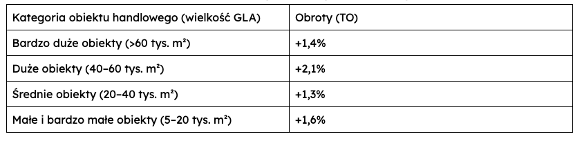 W lutym dodatnią dynamikę odnotowano we wszystkich kategoriach wielkości obiektów handlowych. Najlepsze wyniki osiągnęły centra duże (40–60 tys. m kw), gdzie wzrost obrotów wyniósł +2,1 proc.