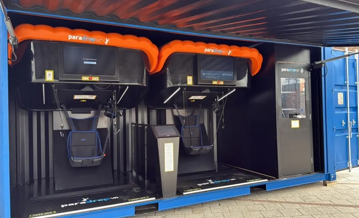 Każdy 20-stopowy kontener mieści dwie jednostki, a wersja 40-stopowa może pomieścić do czterech modułów ParadropVR, zapewniając wysoką przepustowość w lokalizacjach sezonowych lub stałych. Konfiguracja obejmuje kiosk do przyjmowania i oprowadzania gości oraz obsługuje elastyczne opcje płatności — w tym monety, karty i opaski RFID — co czyni go idealnym rozwiązaniem dla parków rozrywki, targów i miejsc tymczasowych.